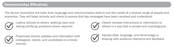 For example, the ability to communicate effectively is a common competency that we recommend (and the research shows) every organisation include in their Leadership Competency Framework. Examples of observable communication behaviours are below.